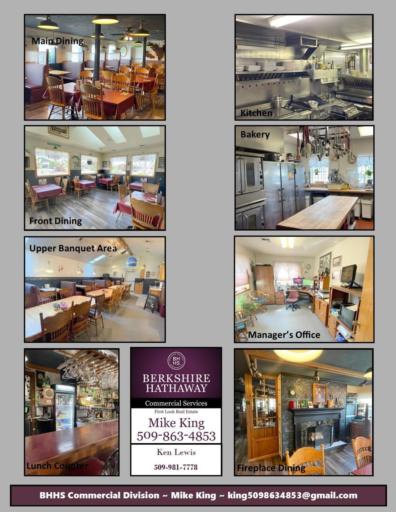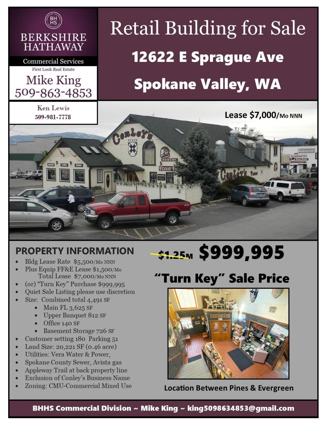 Please contact Mike King to Schedule a Property Tour. 509-863-4853 Do not disturb employees or customers, quiet listing please use discretion. Sale Listing $1,200,000 Lease Listing total combined $7,000/Mo NNN Turn Key restaurant to include FF&E (Furniture Fixtures & Equipment) Excludes the Conley Restaurant Name (not to be included)