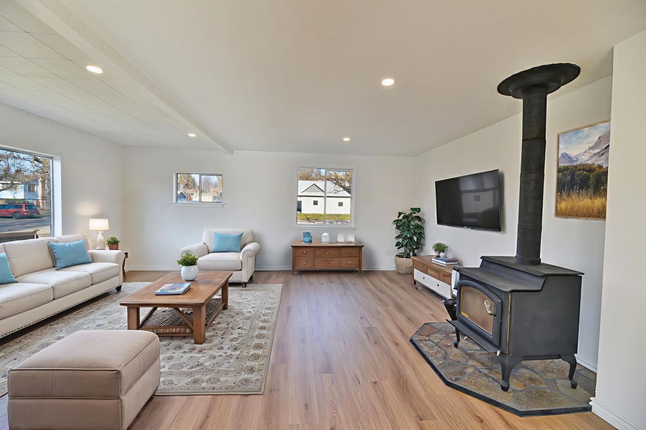 This newly remodeled 5-bedroom, 2-bath home sits on a private, fully fenced corner lot and offers space to grow and entertain. Upstairs, the open living area is anchored by a cozy wood-burning stove and flows seamlessly into the dining nook and stunning new kitchen with stainless steel appliances. Two bedrooms and a full bath complete the main level. The lower level features three additional bedrooms with egress windows, a brand-new bathroom, and a generous utility/laundry room. Step outside to the covered back porch and enjoy year-round grilling and relaxing. An oversized 2-car garage with bonus space above provides endless possibilities for storage, hobbies, or a future workshop.