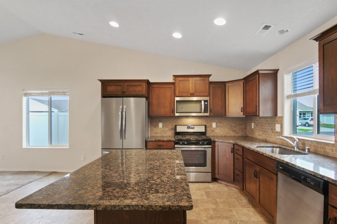 NO STEPS TO CONTEND WITH in this 3 bedroom., 2 bath rancher on an OVERSIZED CORNER LOT! Great-room design. Granite counters including island for additional eating space, stainless steel appliances (refrigerator, dishwasher, micro-hood, gas range), and upgraded cabinets. Primary suite has a walk-in closet and full bathroom. Gas water heater, central air, and energy-efficient gas furnace. Spacious 2-car garage, covered patio, sprinkler system, fenced back yard. Convenient location (Sekani Neighborhood in Airway Heights) close to major shopping, restaurants, coffee shops, fitness center, theater, airport, FAFB, and public transit. The CC&Rs were developed ONLY for the purpose of operating/maintaining a community sewer station (Sekani Utility Association). Water with City of Spokane.